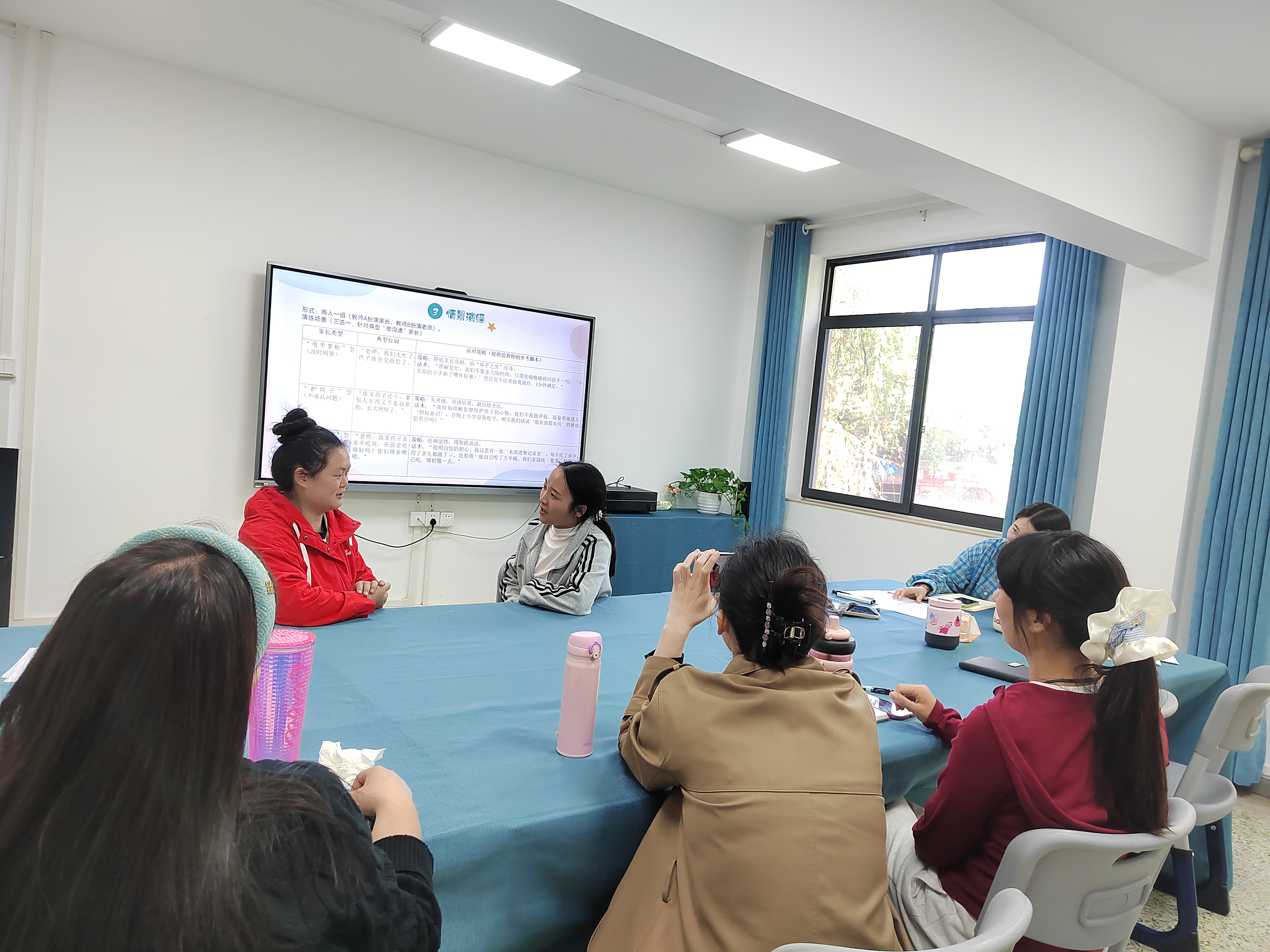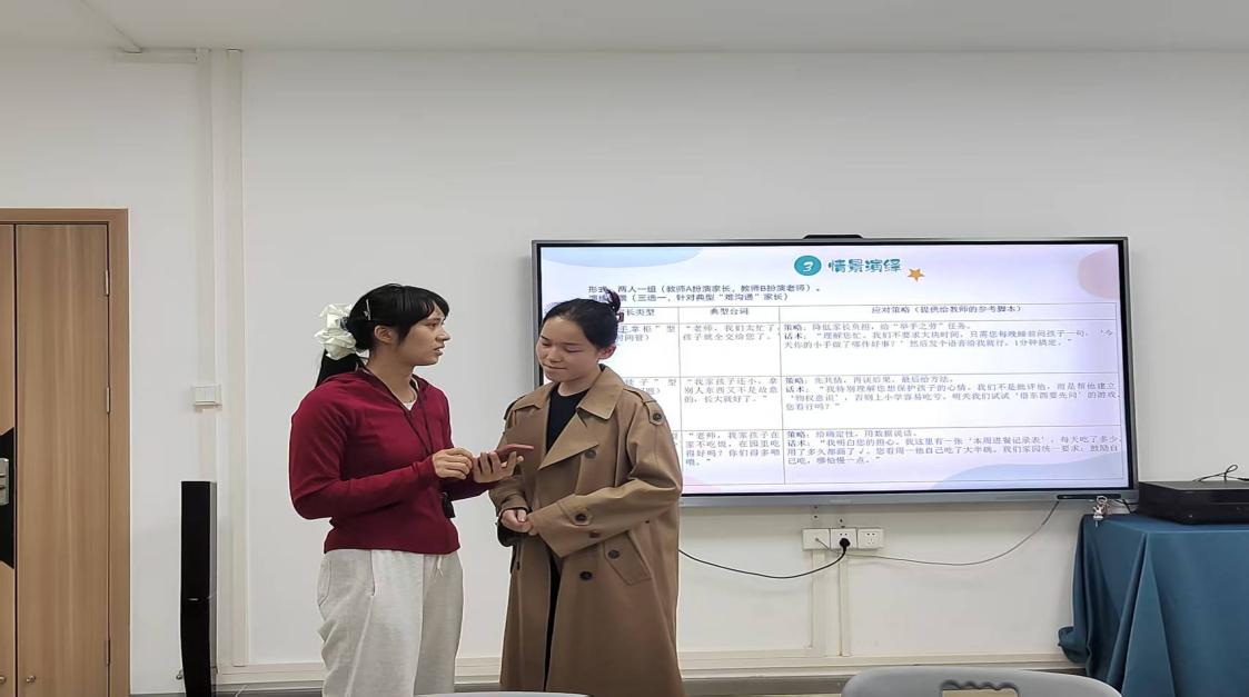 掌握与家长沟通的基本原则与策略技巧后,是分组的情景演绎环节。两人一组分别扮演家长与老师,实战演练典型沟通场景,互评改进,当场巩固应对话术。