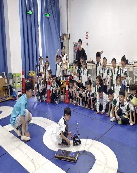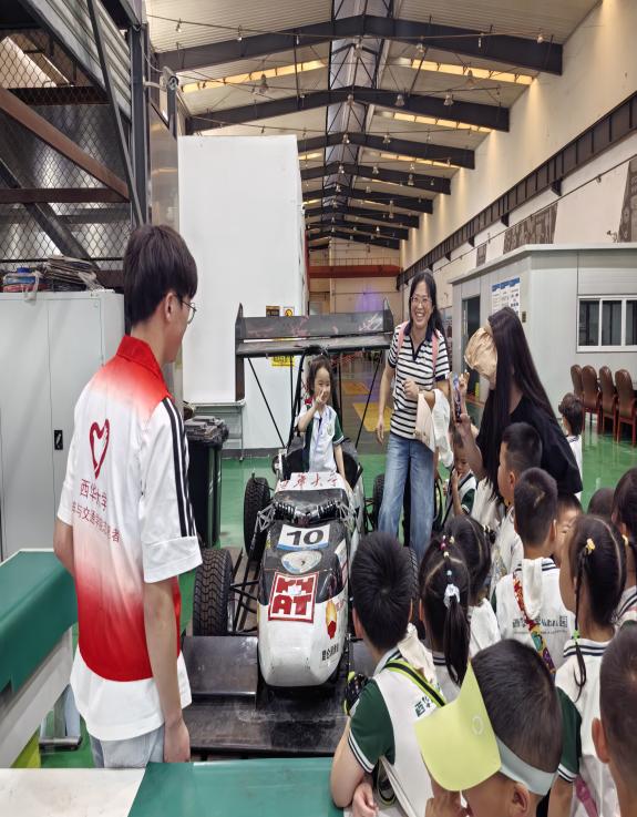 参观结束后,小朋友和汽车学院老师、车队队员及志愿者在实验室前合影留念,稚嫩的笑脸与身后的科技之光交相辉映。“我长大也要造赛车!”“智能车好聪明呀!”孩子们纯真的话语里,满是向往。